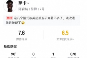 萨卡本场6射2正 1助攻+4关键传球 5过人3成功+6传中2成功 获7.6分
