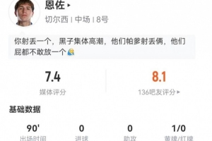 恩佐本场2射0正 13对抗7成功 4抢断4犯规+3造犯规 获评7.4分