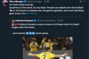 “他从未停止进球。不管是在世界任何地方,任何球队。人们可以争论谁才是足球GOAT(历史最佳),但对于(谁是)最伟大、最无情的射手,却毫无争议,那就是@C罗。”