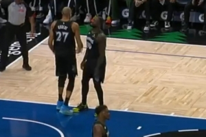 相顾无言~戈贝尔卡住位置准备拿篮板 兰德尔“抢断”失误出界