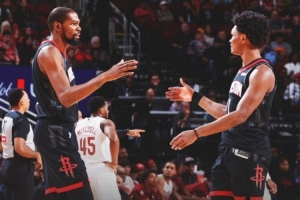 力克骑士!火箭官方晒出赢球海报:杜兰特和阿门击掌瞬间登上封面