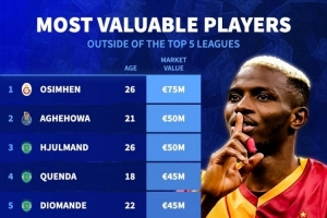 非五大联赛球员身价榜:奥斯梅恩7500万欧居首,阿格霍瓦次席