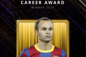 官方:41岁前巴萨中场伊涅斯塔当选环足奖2025生涯贡献奖
