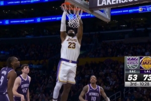 扣爽了!詹姆斯切入空接炸筐 湖人领先20分打停国王