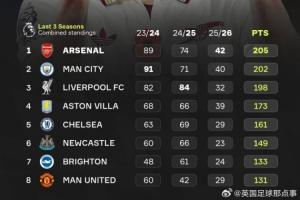 近三个赛季英超总积分:阿森纳第一,维拉纽卡也成功跻身前六