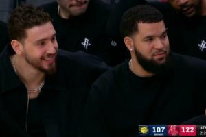 两个病号躺赢爽翻天!申京与范弗里特有说有笑
