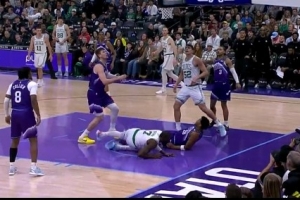 看着挺疼!杰伦·布朗强攻摔倒在地 简单调整后继续罚球