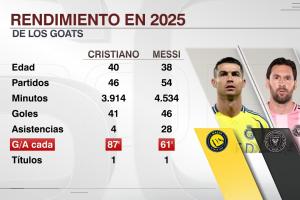 ESPN对比梅罗2025数据:梅西54场46球28助,C罗46场41球4助