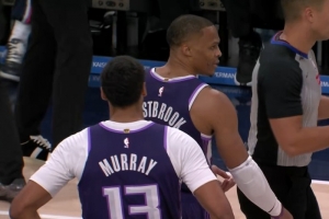 这动作不是太好!小卡突破上篮被威少空中犯规 裁判商量后未回看