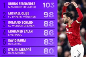 2025年五大联赛创造机会榜:B费居首,萨拉赫、姆巴佩等在列