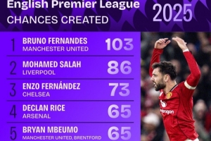 2025年英超创造机会榜:B费103次第一,萨拉赫86次第二,恩佐第三