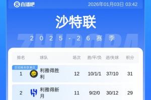 最新积分榜方面,利雅得胜利先赛2分领跑,本轮最后出战的利雅得新月如果能赢球,将实现反超登顶。
