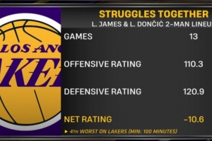 效果不佳!詹姆斯&东契奇同场时湖人净效率-10.6 防守效率仅120.9