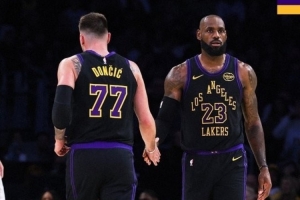 东詹组合带队赢球!湖人赢球海报:封面为东契奇詹姆斯击掌瞬间