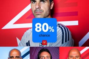 就是今年⁉️英超夺冠概率:阿森纳80%!曼城16.7%,利物浦0.1%