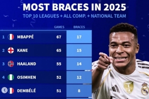 2025年俱乐部+国家队各项赛事双响+戴帽次数榜:姆巴佩均位居首位