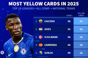 2025各项赛事黄牌榜:凯塞多59场23黄居首,卡雷拉斯、莱默尔在列