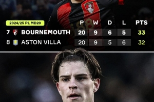 伯恩茅斯上赛季同期高居第7,本赛季少10分只排在第15