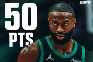 “杰伦·布朗狂轰50分,平个人单场得分纪录,成为伯德和塔图姆之后第三位多次砍下50+的绿军球员,他也是本赛季第10位50+先生。