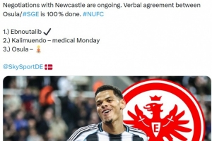 记者:法兰克福正寻求引进第三名前锋,纽卡奥苏拉成为目标