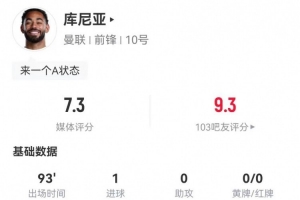 库尼亚本场3射1正进1球+1中框 28丢失球权+15对抗6成功 获评7.3分