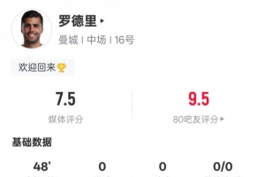 罗德里半场数据:3关键传球4抢断5地面对抗成功,评分7.5