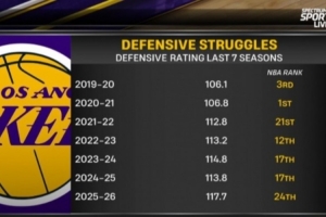 湖人主场迎战灰熊,赛前转播方给出了湖人过去7个赛季的防守效率排名。