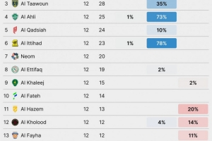 Footy Rankings预测本赛季沙特联赛夺冠概率: