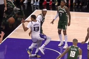 看着不轻啊!基根·穆雷落地时踩到特纳严重崴脚 已回更衣室