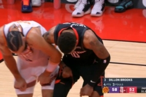前队友互不相让KD罚球时狄龙和小贾卡位 小贾一肘将狄龙推开