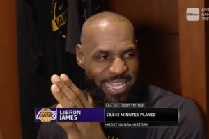 詹姆斯在回答关于明日是否出战背靠背比赛时提到自己是NBA历史出场时间最长的球员,转播商随即打出了詹姆斯的生涯总出场时间:59642分钟,NBA历史第一。