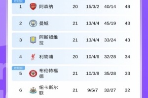英超积分榜:阿森纳未赛5分领跑!曼城维拉均战平,曼联跌至第7