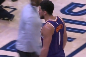 真横!布克半场前最后一攻 突破强攻转身中投压哨弹入篮筐!