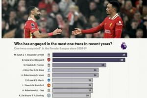 近7赛季英超二过一配合榜:前十5对利物浦球员,第1萨拉赫+阿诺德