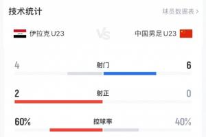 U23国足vs伊拉克半场数据:射门数6-4,射正0-2,控球率46开