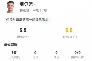 维尔茨本场0射+1关键传球 6对抗4成功+1犯规1造犯规 获评6.9分