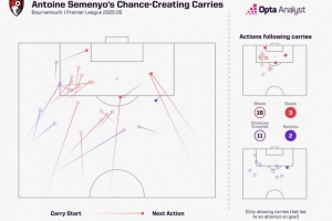突击能力!塞梅尼奥本赛季英超带球创造机会11次、射门16次