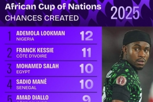 非洲杯创造机会榜:卢克曼压凯西居首,萨拉赫、马内、阿玛德前五