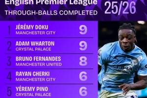 英超成功直塞榜:多库、沃顿并列居首,B费、福登、厄德高在列