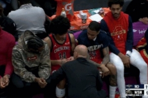 应该问题不大!皮维拼抢篮板落点球时手受伤被换下 队医检查情况
