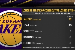 湖人开赛季以后12场失利均输两位数 已经是NBA历史纪录!