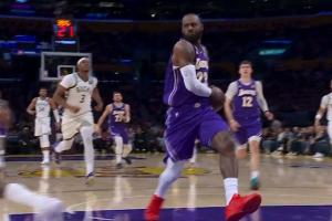 装到了!詹姆斯快攻一条龙大回环炸球过掉小波特还瞪一眼&扣篮