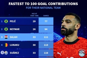 国家队最快直接参与100球榜:萨拉赫第3,梅西第6、C罗第9
