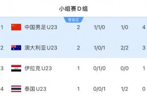 积分榜:U23国足积4分升小组第1,澳大利亚积3分位列第2