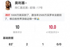 奥利塞本场5射4正进2球+1中框 1助攻+4关键传球 获评10分满分