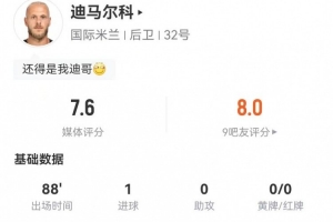 迪马尔科本场1球+16丢失球权 5传中1成功+4长传0成功 获7.6分