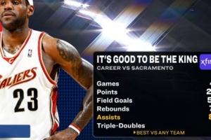 老詹生涯46场对阵国王:场均26.7分7.8板8.5助 命中率51%&9次三双