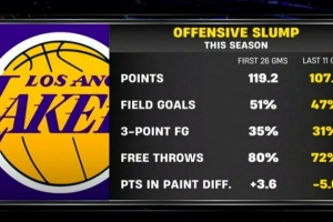 进攻低迷!湖人近11场比前26场场均得分少近12分 命中率均有下降