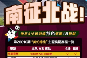 第26010期传足4/6场游戏特色奖期已经于2026年1月11日20:00开售,将于2026年1月14日22:00停售,并于2026年1月16日开奖,其中切尔西VS阿森纳、科隆VS拜仁慕尼黑、莱比锡红牛VS弗赖堡、科莫VSAC米兰为4场进球游戏竞猜赛事。