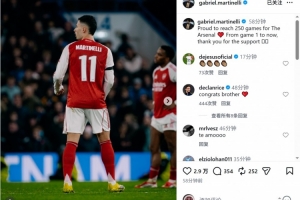 此役马丁内利替补出场,达成阿森纳生涯250场里程碑,赛后他在社交媒体上写道:“很自豪为阿森纳出战250场比赛,感谢大家从第一场到现在的支持。”
